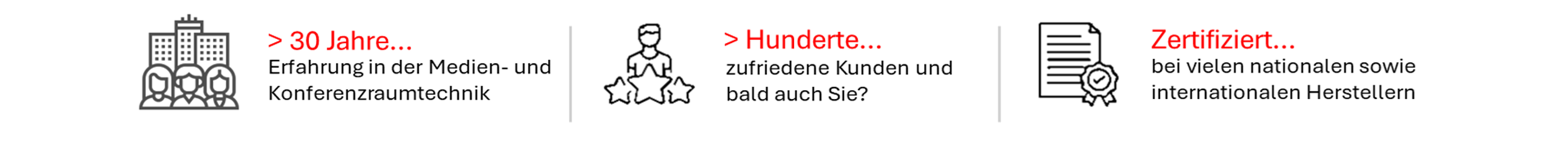 Die medientechnische Ausstattung von Konferenzräumen, Seminarräumen, Meetingräumen, Hörsälen, Videokonerenzräumen und Foyers ist unser Metier.